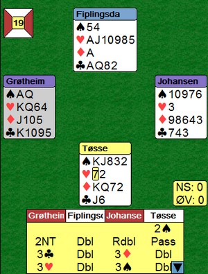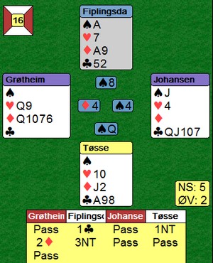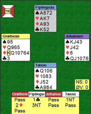 Her var Ole Johnny Tøsse veldig dyktig som spillefører i 3NT. Glenn Grøtheim spilte ut ruter konge og skifta til hjerter til esset i bordet. Så en liten spar til tieren, kløver til kongen og mer spar. Øst stakk med kongen og spilte hjerter knekt (en liten hadde aktuelt være bedre)