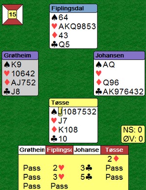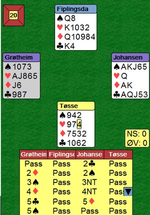 Så en katastrofe av Grøtheim - Johansen. Syd åpnet med svake to spar og så vet vel ingen hva som skjedde videre. 3spx kosta ikke mindre enn -1400.