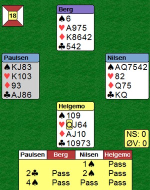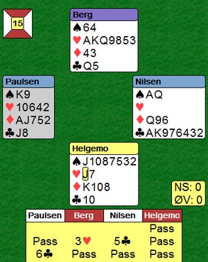 Her var John Arthur Paulsen både dyktig og heldig. 5kl viser krutt og kanoner, så da mente Paulsen at et ess og en konge var nok til å melde slem.