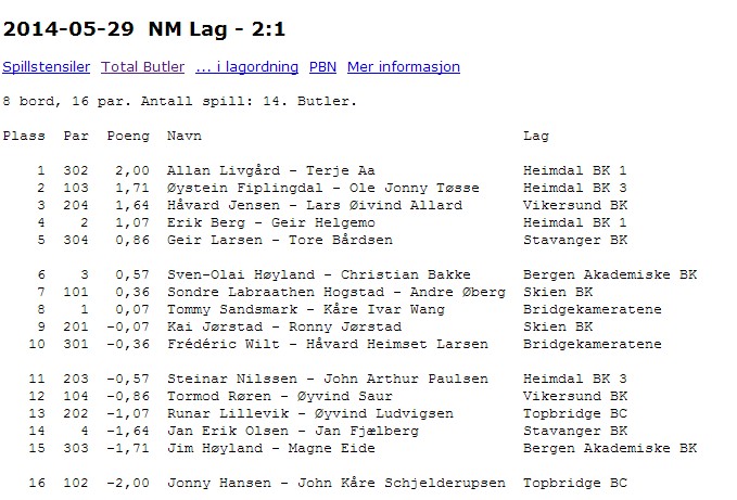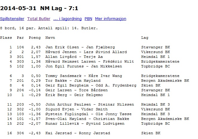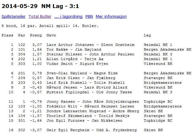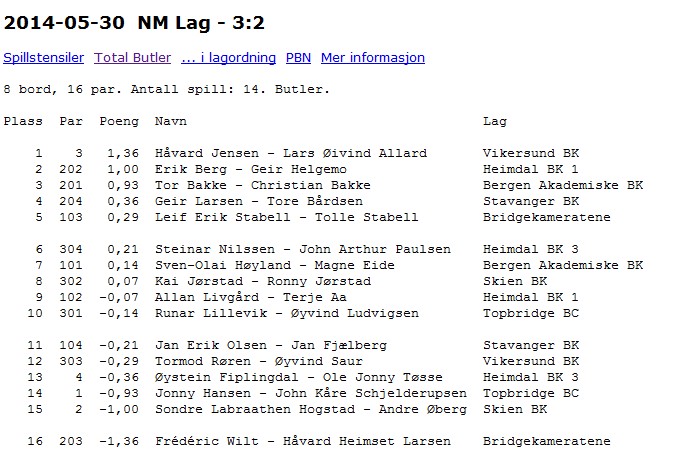 Morten og Arild ledet fra runde 3. Ledelsen 5 runder før slutt var veldig stor. Selv om de også spilte pluss de neste rundene, så kom det et par fra Asker (Hilstad-Harreschou) med en knallspurt de 4 siste rundene. Tilfeldighetene gjorde at i siste runde skulle disse to parene møtes. Da sto det helt likt mellom disse og bordets resultat var kritisk.