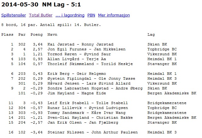Det var noen som i presentasjonen sin av laget før turneringa sa omtrent følgende. "Det er et mål at når vi er spillefører, skal vi tilsammen ha flere trumf enn motparten". Jeg vet ikke om Kai og Ronny Jørstad har dette prinisppet i sitt system, men det burde de hatt. Etter kampen la far seg flatere enn flat og tok på seg 100% av skylda, men da lagkameratene for tredje gang ba om forklaring på meldingsforløpet sa Kai klart i fra om at "Nå setter vi oss ned, dere. Så snakker vi resten av kvelden om dette spillet." Da ble det stilt i fjøset. .-)