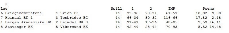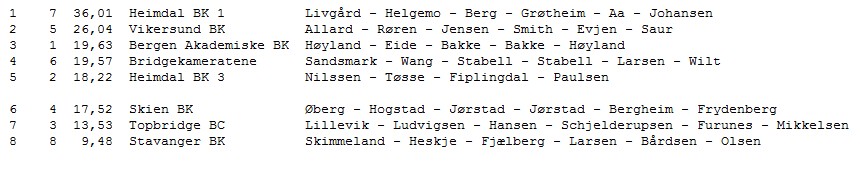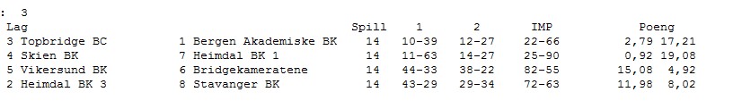 Denne gangen var det Topbridge og Bergen Akademisk som ble vist på BBO. Bergenserne ligger på middels etter to kamper, mens Topbridge har fått en tung start. BAK vant fint i første kamp, men fikk juling av Heimdal 1 i andre.