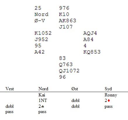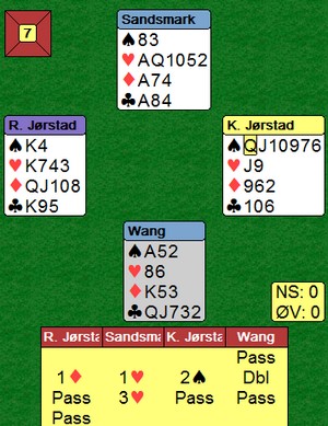 Nå handlet det om å bli kvitt ruteren, så Sandsmark spilte en liten kløver til damen. Ronny hadde ingen problemer med å lasjere den og da ble spillefører hengende med ruteren sin. EI beit.