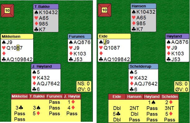 Når makker har vært i pass, synes jeg vi skal være mer "frie" i valg av åpningsmeldin, spesielt utenfor sonen. Johnny Hansen valgte 4hj og da kan jeg ikke se hvordan ØV skal komme seg på banen. To beit (skulle vel vært tre?) I det andre rommet åpnet Nord med 3hj og da doblet øst opplysende. ØV kom til 4sp og når det satt så greit som det gjorde, var det 10 stikk selv med ruter konge ut. Syd kommer aldri inn for å få hentet DJ i ruter. Tre i spar, ett i hjerter, ruter ess og fem i kløver blir ti tilsammen.
