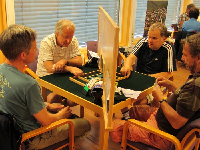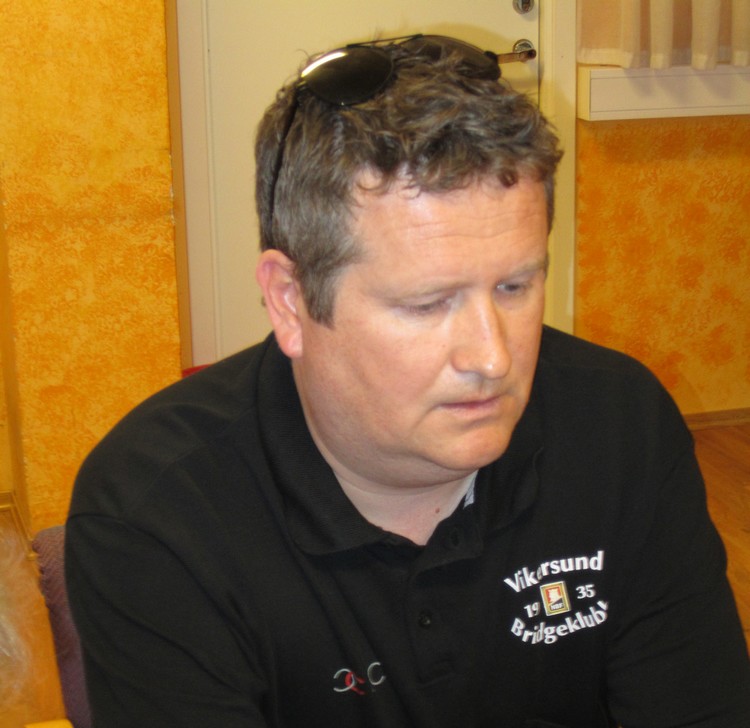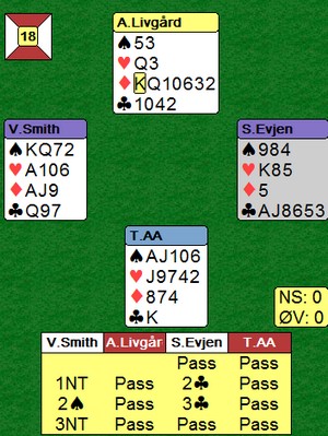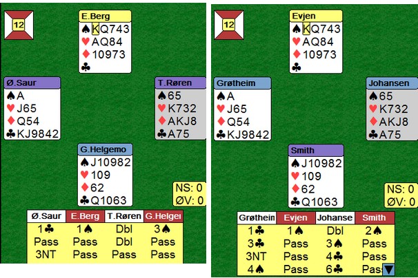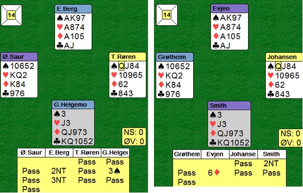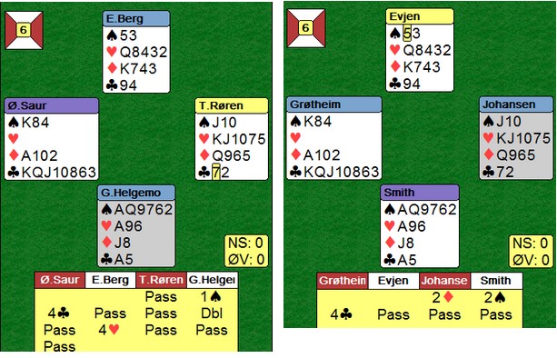Trond Bårdsen spilte ut kløver fem til esset. Mer kløver til kapp, ruter til esset og spar til damen. Hjerter knekt seilte rundt til øst som godspilte kløveren. Glenn fant ruteren ved å spille til damen og kappe på tieren før hjerter til nieren sikra det niende stikket.