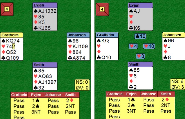 Glenn spiller ut hjerter 2 og finner makkers farge. Syd stikker og bommer ruteren, noe som ser naturlig ut. Mer hjerter som syd vinner. Han tar tre ruterstikk og spille kløver til knekten. På de to ruterne, kasta Lars Arthur to kløvere og har med det latt makker i stikken med holdet i begge svartfargene. Det kunne vært kritisk, men ikke når du har sånn oversikt som nordlendingen. I posisjonen over til høyre, tar han for hjerter 10, men IKKE hjerter knekt !!