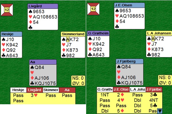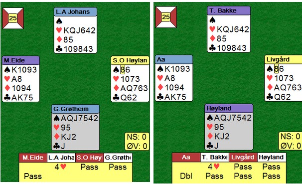 Hvis noen som spilte bridge for et par tiår siden og kom tilbake til manesjen i dag, ville de blitt rimelig sjokkert over hvordan det meldes. Både Tor Bakke og Lars Arthur Johansen åpnet med 4hj på hånda under. Magne Eide klarte ikke å være med i siste hånd, mens Terje Aa la fram den røde lappen. Begge gikk to beit og en femmer til Heimdal.
