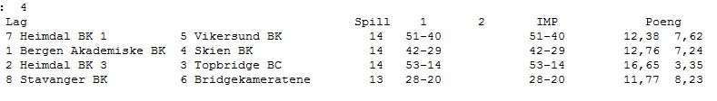 Arrangøren ønsket at alle lagene fikk minst en kamp på BBO. Fram til nå var det kun Stavanger som ikke har vært på TV, så da sendte de kampen Heimdal 1 - Stavanger. Heimdal ledet med flere mil på neste lag, så kampen var ikke spennende med tanke på sluttresultatet. Vinnerne har vært mye på BBO, men jeg synes ikke denne kampen var den beste de har spilt. For en gang skyld kunne vi se at Geir Helgemo gikk beit i en 3NT der det andre bordet fikk elleve stikk, uten at det nødvendigvis betyr at den ene spilte så mye mer riktig enn den andre.