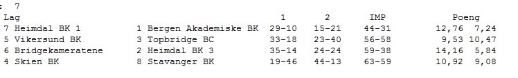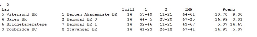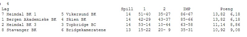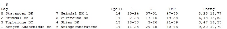 Andre halvrunde starter forsiktig med mange flate spill. I spill 18 levere Allan og Terje et flott motspill mot 3NT og beiter der det blir elleve stikk på det andre bordet. Kampen mellom Heimdal og Vikersund ebber ut uten de store spillene og ender 13.82 - 6.18 til trønderne. BAK ligger på andreplass og de vant nøyaktig med samme sifre.