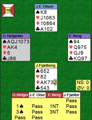 Erik Berg starta med spar ess og skifta til kløver. Esset vant stikk og så seilte ruter 9 rundt (!). Nord hadde vist blakk i ruter med sin 4ru, så det var sikkert ikke noe kunststykke for stjørdalingen. Kløver til stjelling og kongen kom på. Spar til røff og ruter til damen. Så alle ruterne untatt den siste. Posisjonen er over.