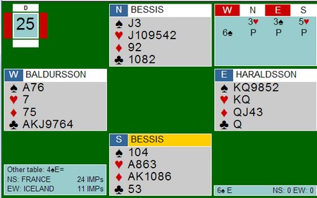Syd servet en liten kløver, og tieren vant. Så fulgte hjerter til damen og hjerter ti til kongen og esset. Nord vred spar, og Christian Bakke tok fem stikk i den fargen. Blindemann holdt tre ruter og dobbel hjerter. Ruter ti ble dekket med knekten, og Christian brukte esset! Hjerter 9 satte inn Nord som var nødt til å gi bordet et rødt stikk og kontrakten. At det ble overstikk spilte egentlig liten rolle. Det ble 11 imp uansett. Snill sparsits men nydelig spilt!