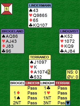 Espen og Boye har kontroll på hva 2NT viser, men ingen har system som fullt ut klarer å få kontroll på slike hender. Espen foreslo 3NT som kontrakt med sin gode hånd. Nå vet Boye at Espen har endel kort siden 2NT kan være svak, men samtidig er det ikke majorhonnører han er ute etter. Han gjorde allikevel et forsøk med 4 hjerter som viser kortfarge, men Espen som ikke har kontroll i spar kan ikke gjøre annet enn å melde 5 kløver. Har makker feks 2-0-5-6 tar jo motparten de to første stikkene i spar. Et vanskelig spill! |