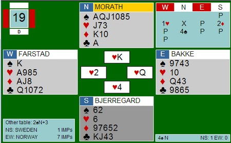 1NT-åpningen fra Nunes i Syd viser 12-14 hp. Doblingen av  2 hjerter (overføring) fra Thor Erik ser ut til å være opplysende dobling og Thomas setter maks press med 4 hjerter. Fantoni i Nord har hørt makker vise god sparstøtte med 2NT og velger 4 spar. Det er nok en kombivariant, på en god dag står kontrakten og det kan også være en god stamp. Denne gangen er det hverken fugl eller fisk og +500 til Norge er 9 imp når Espen og Boye kjøper kontrakten i 3 spar med 2 bet på det andre bordet.