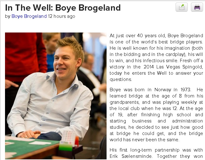 mens i spillet under fikk Boye kjeft av Ramakommentatorene for å passe 3NT med sine fem kontroller. Kanskje skulle Espen meldt ruteren sin en gang til? 6ru i øst en en veldig fin kontrakt. Det kommer helt sikkert spar ut og da spiller 12 stikk seg selv.