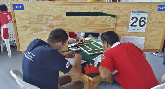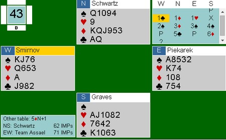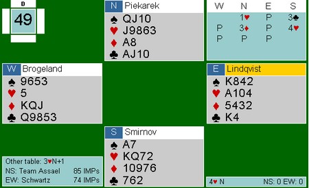 Jeg halshugde Thomas Charlsen i EM for å løfte 6kl til 7kl uten å være sikker på at trumfen var god nok. I dette spillet tok Espen mot til seg og meldte 7hj uten å være helt trygg. Spillene er overhode ikke sammenlignbare, for det er vanskelig å se for seg hva makker Brogeland skal ha for sin 5NT uten fin trumf. LIkevel, likevel. :-) Uavgjort spill forteller om at nivået er høyt.