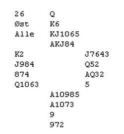 "Nei, Snurr. Det er ikke Lavintahl i denne posisjonen". Jeg bøyer hodet i skam, men spør ærbødigst hvordan vi skulle klart dette hvis vest hadde hatt f.eks kløver knekt og spillefører K10, slik at jeg MÅTTE tidlig inn? Dette også gitt at spillefører han dobbel ruter.