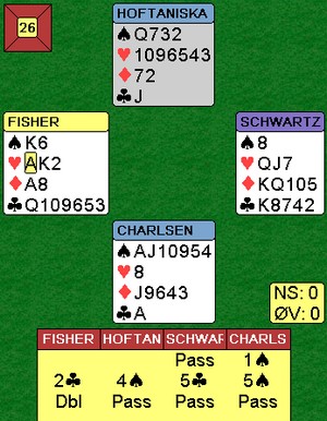 Jeg er ikke helt sikker på hva 2kl fra Hoffa er i andre melderunde. De spiller en Gazelli-variant over 1Major - 1NT og det ser ut som dette er noe av det samme. (2kl viser en god hånd- minst 15 hp) I alle fall ble 2kl alertert ved bordet.