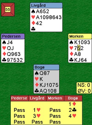 De fleste kom i 4hj i nord, men minst en spilte kontrakten fra syd og fikk kløver ut fra vest rett opp i ED. Det forsvant to ruter og elleve var sikret.