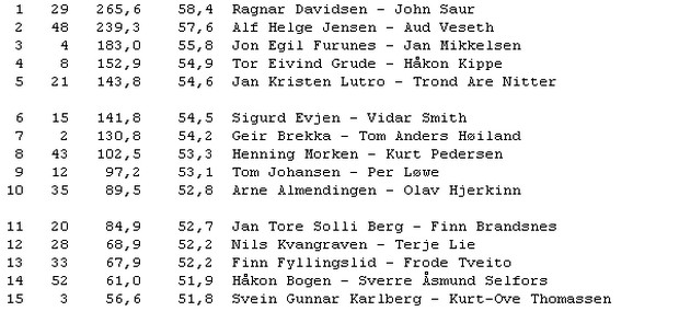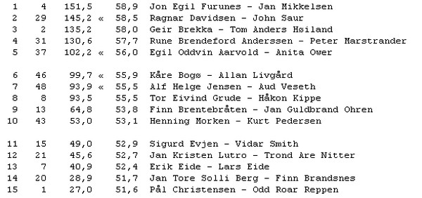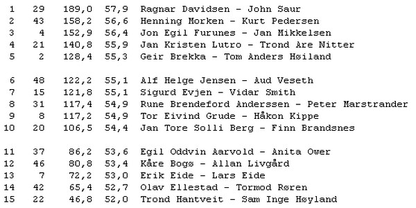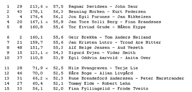 Det er vikarene Jon Egil Furunes og Jan Mikkelsen som har tatt teten. Det mest dramatiske hittil er at en av forhåndsfavorittene, Odin Svendsen og Petter Tøndel, har måtte melde forfall på grunn av sykdom. Siden mange hevder at jeg har blitt en fløtepus her på bloggen etter at jeg forlot Kristiansandbik.org og har blitt ofret på kapitalens alter, burde jeg sikkert sagt at Odin Svendsen har vært på grisefest og blitt buret inne i fyllearresten, men jeg får meg liksom ikke til å lyve bare for å være paparazzi. Tøndel er visst rett og slett blitt syk.