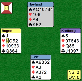 Jeg så flere vellykka Multi-åpninger i dag, men denne av Grøtheim - Tundal kosta 1100. Sikkert en "opplagt" dobling av Petter, men jeg synes nå det er fint å se på likevel. Mange ville meldt 2sp på øst sin hånd (pass med spar og meld 3hj/4hj hvis du ikke har). Da blir det verre å få tatt ØV, men det er mulig 2ru - 2sp betyr noe annet for ØV.