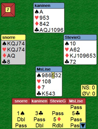 5 kløver som fikk stå udoblet var ubetelig, ruterhonørene satt gunstig til for Klev som enkelt fikk hjem kontrakten med 11 stikk. Ren topp.
