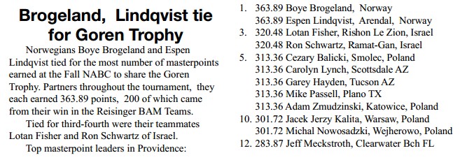 Boye og Espen dokumenterte bra form i Mitchell Board-a-match teams der de kom på tredje plass, og fulgte opp med en 7. plass i Blue Ribbons Pairs, med mange hundre deltagere.