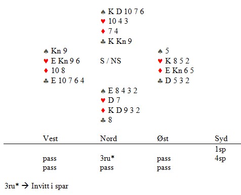 Jeg refererer: "Makker spilte ut ruter 10 til mitt ess. Så hjerter to tilbake til knekten og makker tok for esset. Så visst han ikke hva han skulle gjøre, fordi spillefører kunne da ha 5-3-5-0 og kløveresset var katastrofe. Han spilte en hjerter til, men da føyk dette hjem. Ut med trumfen og ruter til nieren. Alle bordets kløver forsvant. Min feil, fordi jeg skulle spilt hjerter fem tilbake og fulgt på med toeren for å vise fire stykker!"