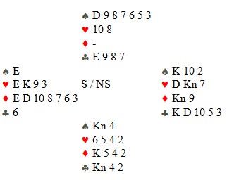 I åpent rom åpnet Muller (Ø) med 1 ruter og Nunes (S) gikk innpå med 1 spar. De Wijs (V) krevde med 2 spar, Fantoni (N) passet og Ø gjenmeldte 4 kløver. Etter cue av 4 spar som N doblet gikk det pass til V som la kontrakten i 6 ruter. Hj 7 ut, 1. stikk til Monaco, men resten sto for +1370.