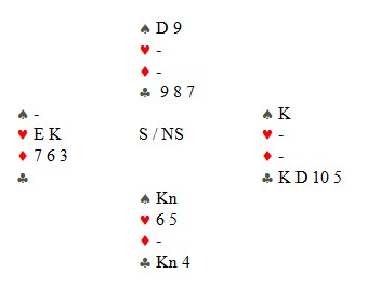 Hans spilte ut ru A og skiftet til kløver som løp til damen i V. Hj 3 i retur gikk til kongen og Hans fortsatte med kløver. Marthinussen måtte velge og bestemte seg for kl A i frykt for at Astri også hadde kongen. Nå var det tid for å ta to runder trumf, og da damen stupte dobbel i Ø kunne N deretter spille ru D som dro ut markert konge i Ø. Kløver til røff og på to gode rutere kunne N sake hjerter i bordet og få 9 stikk i alt. Tor Martinsen- Jan P. Johannesen fikk samme resultat for delt topp. I 1 NT som resten spilte vant 2 mens 1 gikk 1 bet.