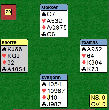 Inne på spardamen kommer det kløver 7 til stjeling hjemme. Jeg stjeler en spar og esset faller i øst. Nå kan jeg ikke stjele meg hjem i i kløver enda, så jeg spiller en ruter til tieren og esset i vest. Det kommer mer ruter til min dame. Øst følger to ganger.