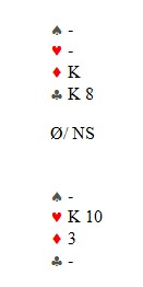 Jeg spiller sparen min, men vest har ikke mer. Øst har altså falsecardet fra E10 igjen, men det er ikke så farlig. Jeg stjeler med hjerter knekt, tar for hjerter ess og stjeler meg hjem med kløver til hjerter åtte. Vest kaster en ruter. Nå er stillingen: