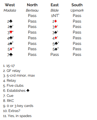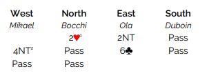 Ved det andre bordet fikk spillefører (syd) kløver 6 i utspill og hadde to stikk i den fargen pluss ett ekstra ved å trumfe den siste kløveren. Han vant første stikk med damen og trumfet den lille kløveren. Så spar mot hånden.