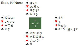 Nå spilte han liten ruter til tieren og vests knekt. Vest skiftet til hjerter, og på liten fra nord stakk øst med kongen. Derfra kom ruter. Nå stakk spillefører med nords konge og spilte ruter til esset. Hvis den fargen sitter 3-3 gir den ett ekstra stikk og ti i alt. Men i denne situasjonen hadde han flere sjanser: