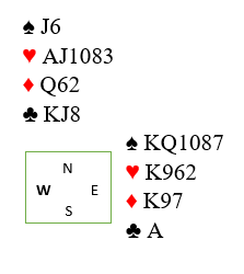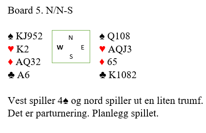 Det ville ikke fungert for forsvaret om det skiftes til liten hjerter i tredje stikk. Da kan kontrakten vinnes. Spillefører stikker vests dame med esset og drar ruter dame til kongen, esset og vests knekt. Så spilles simpelthen hjerter, og øst blir innspilt. Øst kan: 1) spille trumf, men da kan finessen med åtteren tas. 2) Øst kan spille hjerter, men da får nord komme inn og den dype ruterfinessen kan tas. 3) Øst kan spille spar, men da trumfes hos nord fulgt av ruter til åtteren.