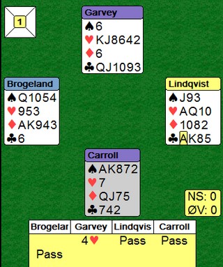 Espen vet at 4hj er beit, men kan ikke doble fordi makker vil nesten alltid ta ut. Fem udobla beiter når Boye ikke kunne holde oppe i siste hånd. Likevel 3 IMP inn.Simon Gillis åpnet med 2hj på det andre bordet og fikk spille det. De samme fem stikkene, men "bare" tre beit.