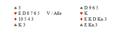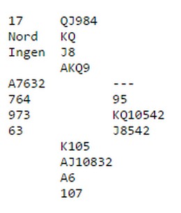 I spill 13 balanserer Calle Knutsen over motpartens 1NT ved å melde en farge som motparten har vist. Vel hadde han KDKnxxx, men ellers svært tynt. Geir Brekka hadde nesten beita på egen hånd og i tillegg hadde makker åpnet. Han passet uvanlig ut og henta tre sonebeit. Det var likevel verdt 9 IMP når Baumann - Svindahl hadde score inn.