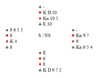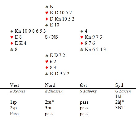 Singel ruter hos makker var kanskje ikke det beste Karl Olav kunne ønske seg, men til tross for at makker gikk ned i 4hj over 3sp, meldte han en gang til. Da hoppa Calle ut. Når ruterkongen satt tredje i kapp, var det ikke mulig å gå beit. Karl Olav stjal to ruter og kongen kom deisende på. Hjerterkongen til motparten, men +1430.