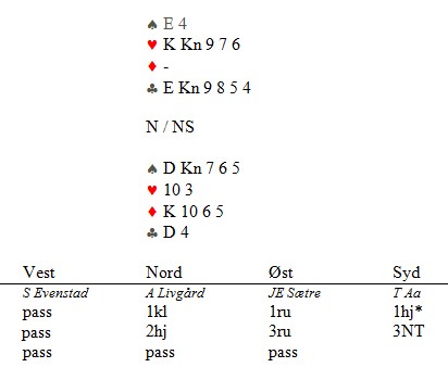Jeg har spurt både Geir Brekka og Erik Berg om spill fra 6.rundekampen, men i følge dem var det bare dårlige prestasjoner. Ingen av dem er vel kjent for å være spesielt beskjedne, så det hørtes ut som ingen var superfornøyd med innstatsen. "Vi scoret over 100 IMP", sa kaninen. "Når det ikke holder til seier er det keeperen det er noe galt med, ikke angrepsrekka". Han er inne på noe der.