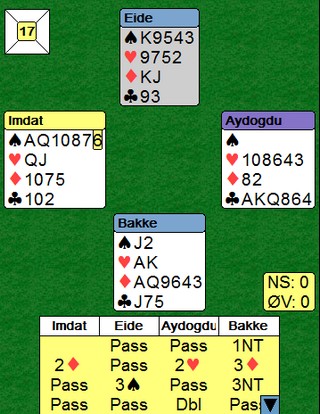 Her var Norge griseheldige som stoppa i 1NT med 27 hp tilsammen. Det ble ni stikk.