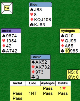 Harald Eide legger liten i bordet (!) og vest vinner med damen. Hvis vest skifter hjerter eller kløver, tror jeg dette blir et tungt prosjekt, men han spilte mer ruter for å prøve å gi makker en stjeling. Nå var Harald ovenpå og kastet en hjerter på ruter ti og enda en på ruteresset. Øst stjal, men nå var det slutt. Trumfen satt greit og kløverkappen gikk. Harald fikk altså 3+1+4+2 = 10 stikk.