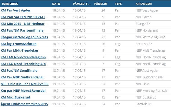 og det jeg tenker på er måten vi kvalifiserer par til NM par. Her ser du antall deltakere i kretsenes KM par i helga.