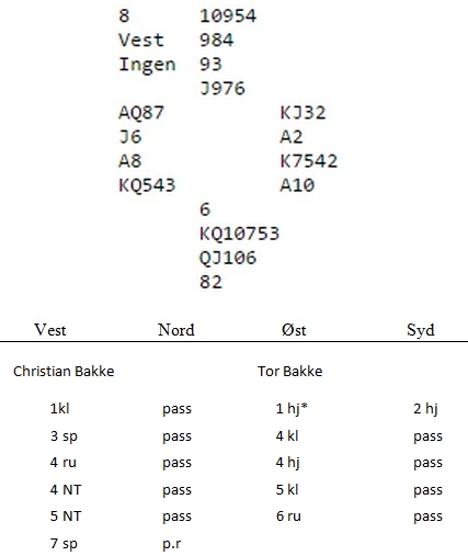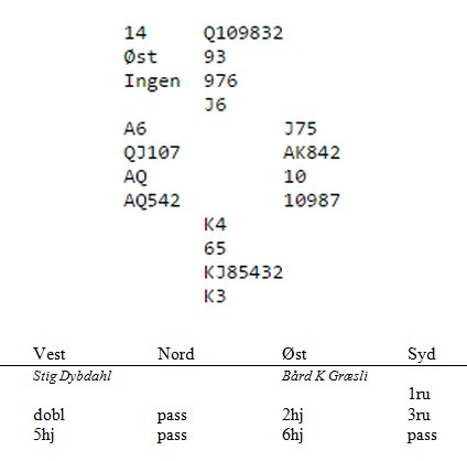 Den logikken kan en vel diskutere , men i spillet under likte jeg 5hj veldig godt. "Se på hjerteren din makker. Jeg kontrollerer de andre fargene, men trumfen min er tynn." Ingen vitenskapelig meldning, men praktisk og en unngår misforståelser med en ny makker.  Kun fire par kom i slem og med snill sits vant alle 13 stikk.