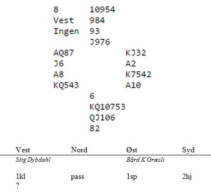 Stig Dybdahl har sendt en hyggelig mail og forteller om både god spilling og bra glid under Trondheim Cup lagturnering. Han har behov for å komme med et spill eller to for som han sier: " I fare for at siden din kommer til å bli et eneste Klukken show de neste månedene, så tenkte jeg å legge med et spill eller et meldeproblem. Ihvertfall for Kunstneren som nekter å diskutere system fordi da kan det bli systemsvikt."
