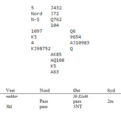 I pausen traff jeg Klukken og spurte om han kom i utgang. Svaret ser du over. Syd åpnet med Multi 2ru (svake 2 eller en20-21 NT). Nå kom ØV (!) i 3NT på sine 16 honnørpoeng tilsammen.