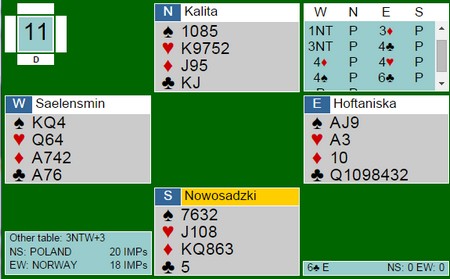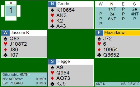 Hva så med slemmene i Polen? Under finner du de fleste av de store spillene og jeg synes det var mye bra. Ikke alle parene som var med er like samspilte, så det får være med i betraktiningen. Jeg er klar over at bridge i etterpåklokskapens lys er en lett øvelse, men det er også et faktum at over tid er de beste spillerne de beste. Også i slemsonen.