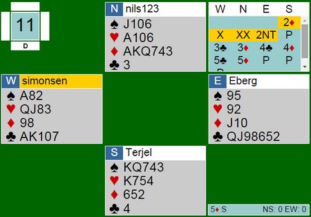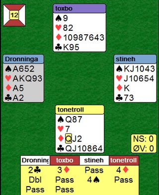 3ru i ugunstig er med hår på brøstet av Tonje Brogeland. 4ru følger opp og da skjønner jeg ikke hvordan ØV skal komme i slem. 6sp på det andre bordet og en stor gevinst.