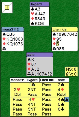 Det er noen ganger en ikke skal melde så mye og dette var en av dem. 3NT viser 13-14 gode. Nå ble det uheldig av Terje Aa å cuebidde ruteren sin, fordi da fikk Gunn Helness annonsert ruterutspillet i stedet for hjerter. Du ser sikkert at 6kl steinstår med hjerter ut.