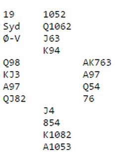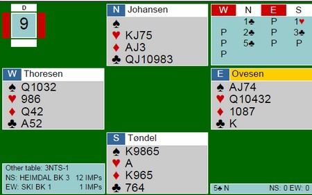 Det er lett å bli etterpåklok når en skal skrive om spill. Dette spillet er kanskje et slikt, men det viser i alle fall at kommunikasjonen mellom Olav Ellestad og Bjørnar Halderaker er på plass. Det kan se litt underlig ut av syd å gå på over 4hj med en minimumsåpning, men poenget er at den er allerede vis med 3hj. Selv da var makker sleminteressert og Bjørnar vurderte sine mellomkort i trumf til å være viktige, det samme med ED i spar og ruterkongen. Det stemte og kontrakten var rett så fin. Det stod i praksis på en av to finesser, og når begge gikk var det tretten stikk. 11 IMP i gevinst mot 4hj +510 på det andre bordet. _____________________________________________________________________