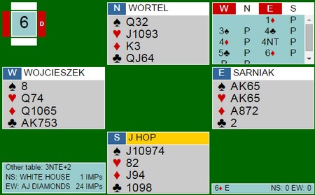 Det ble spilt IMP over tre bord på tirsdag, og Odd Harald og Geir vant feltet. Så fikk de kanskje revansj for nederlaget for ett par uker sida; telefonen sto ikke rolig dagen etter på grunn av meldinger fra en fjøsavløser oppi Engerdaln. Neste tirsdag håper vi på bedre oppmøte, jeg vet om ett par lærere og ett par pensjonister som da er tilbake på banen.