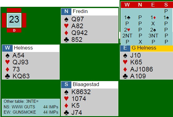 Tor og Geir kommer i en steinhard 3NT, men hadde vest hatt hjerteresset måtte Noralia klart å cashe fire ruterstikk. Nå ble det fire sonebeiter til tross for at EKD i ruter felte knekten. Jon Sveindal fant hjerterskiftet i stikk fire!!
